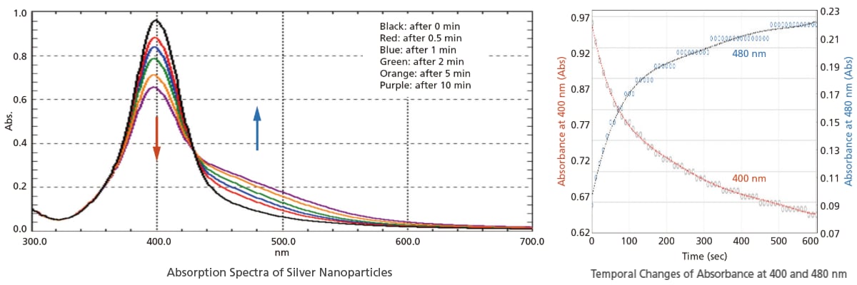 The figures below show the analysis of the particle agglomeration process when salts are added to silver nanoparticles. Measurements of the 300 to 700 nm region were performed in ultra-fast scan mode. In addition to the decrease of absorbance at 400 nm and the increase of absorbance at 480 nm, the temporal changes of spectra can also be observed.