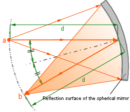 (Distance to center of the sphere surface is d. Light from point a, at distance d from the sphere surface, is reflected by the spherical mirror. An image the same as a is created at point b, separated from the sphere surface by distance d.)