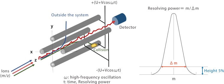 Ions enter the quadrupole region along the central axis (z-axis) and the electric field causes ions passing through the quadrupole to oscillate in x and y directions. Under a given set of conditions, ions of a specific m/z experience "stable oscillation" in the electric field, allowing them to pass through the quadrupole and reach the detector. Ions with other m/z experience unstable oscillation and collide with an electrode or fly out of the quadrupole region and are not detected. Resolving power is a measure of a system’s ability to achieve spectral separation and is represented by m/Δm, where Δm is the peak width at 5 % the peak height at a given mass (m). In quadrupole mass spectrometers that have a quadrupole mass filter, Δm is constant and independent of mass and resolving power is proportional to mass. Although elements are typically separated by a mass difference of around 1 amu (atomic mass unit), analysis is performed based on an Δm of around 0.65 to 0.8 amu.