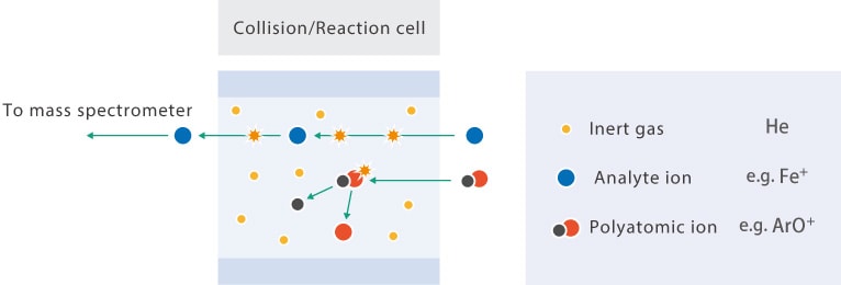 The different features of collision/reaction cells can be summarized as follows. Collision-based interference removal uses inert He gas and can be used with almost all analyte elements because the collisions create no by-products. Meanwhile, reaction-based interference removal separates analyte ions from interfering ions based on their reactivity with a reaction gas. This approach provides more powerful interference removal but is only effective for specific elements.