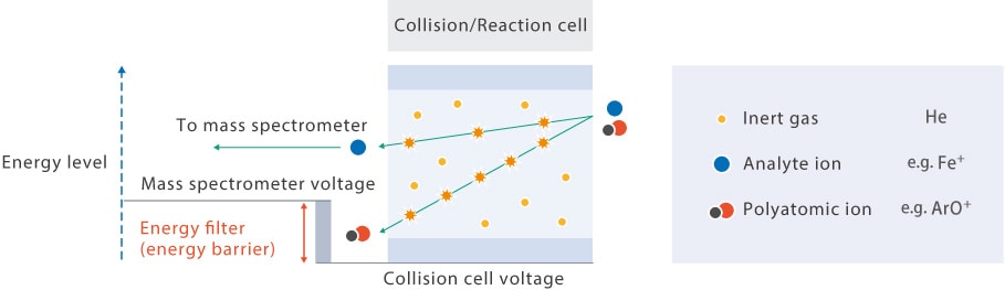An energy filter (barrier) is placed between the collision/reaction cell and the mass spectrometer. Polyatomic ions with lower kinetic energy are unable to pass through this barrier and are prevented from reaching the mass spectrometer. This kinetic energy-based method of separating polyatomic ions from analyte ions is called kinetic energy discrimination.