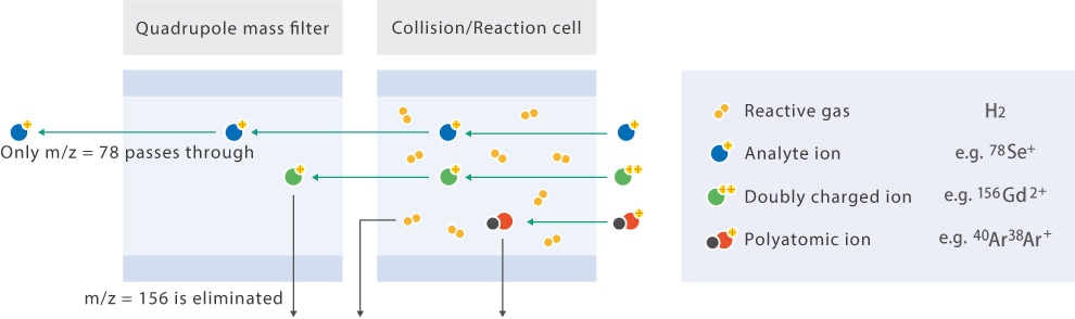 A highly reactive gas is used to remove interferences based on the different chemical reactivity of each element. H2 is the most commonly used reaction gas. An example interference removed by H2 is 40Ar38Ar interference on 78Se. The reaction between Se and H2 is endothermic and thus occurs very rarely, while the reaction between Ar and H2 is exothermic, occurs more readily, and removes interference as shown below.