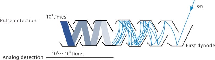 Signals are detected by pulse detection or analog detection. Pulse detection converts the electron amplified 108 times into a voltage pulse and counts the number of voltage pulses (ions) per unit time. Analog detection takes the current amplified 104 to 106 times, converts this current to a DC voltage in the detection circuit and is subsequently measured. Detection automatically switches from pulse to analog when the ion intensity saturates the pulse detection method. Ion intensity measurements are represented in terms of cps (counts per second) and defined as the number of ion counts measured by the detector per second.