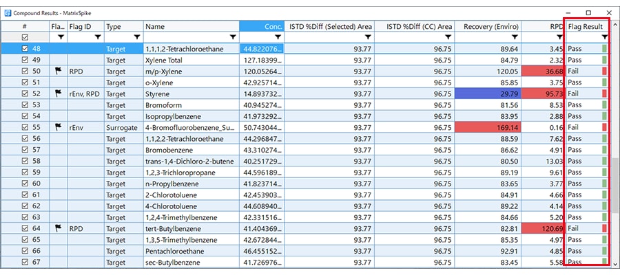 These QC items are compatible with the flagging function. Using this function, items that do not satisfy the threshold value configured by the user are colored, making it easy to identify samples/components that do not satisfy the regulatory values. In addition, using the pass/fail determination function, the flagged results for multiple QC items can be combined to determine a QC pass or fail.