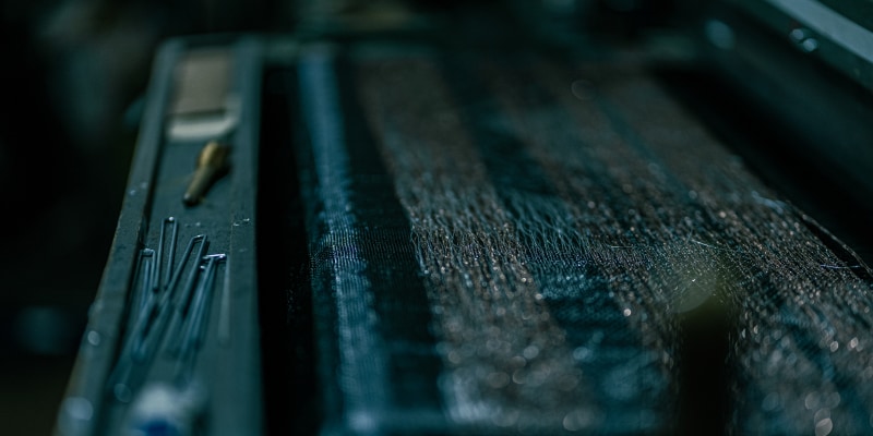 除了编织碳纤维,还运用西阵织工艺将金丝银线编织其中,表现出水流的纹样,不仅具有装饰性,还能通过图案展现其功能性。期待西阵织的应用不仅局限于和服,通过将西阵织技术与岛津设计的现代设备融合,拓展至更多的新领域。