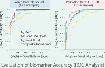 This system enables many types of beta-amyloids to be characterized and simultaneously detected with high sensitivity by analyzing only 0.6 mL of blood plasma. Of these beta-amyloids, Aβ1-42, Aβ1-40, and APP669-711 can be used in combination as biomarkers to estimate the deposition level with high accuracy.