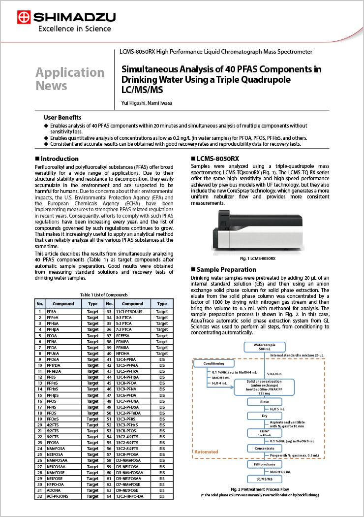 Simultaneous Analysis of 40 PFAS Components in Drinking Water Using a Triple Quadrupole LC/MS/MS