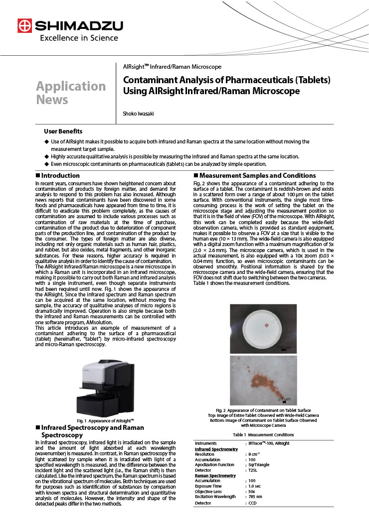 - Even microscopic contaminants on pharmaceuticals (tablets) can be analyzed by simple operation.