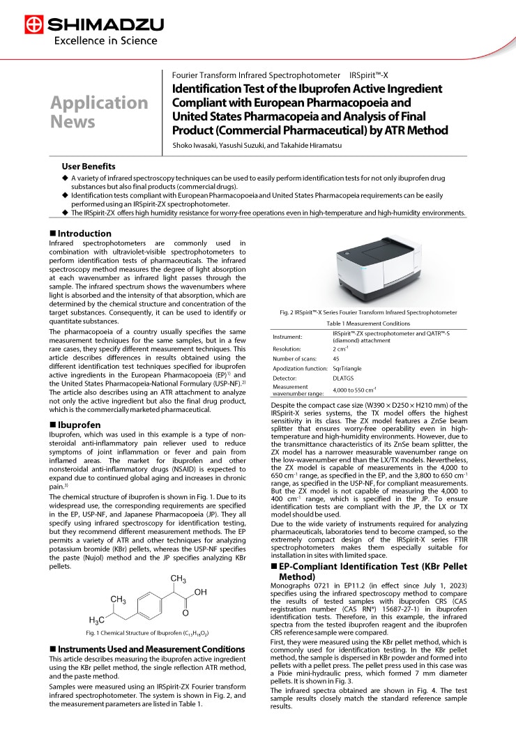- Identification tests compliant with European Pharmacopoeia and United States Pharmacopeia requirements can be easily performed using an IRSpirit-ZX spectrophotometer.