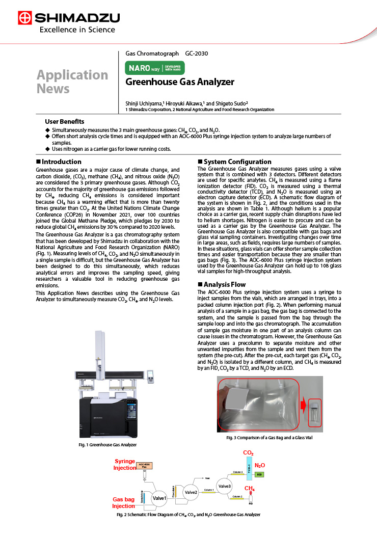 As a specialized gas chromatograph (GC) optimized for measuring greenhouse gases (GHG) caused by climate change, Greenhouse Gas Analyzer can simultaneously measure carbon dioxide (CO2), methane (CH4), and nitrous oxide (N2O), the three components that account for 95 % of GHG. It combines Shimadzu’s high-end Nexis GC-2030 gas chromatograph system with NARO’s patented technology for simultaneously analyzing three GHG components. It is equipped with 3 detectors and columns that ensure reliable simultaneous analysis of the three GHG components. It also supports using small vials as sample containers, in addition to conventional gas bags. It can achieve the high accuracy and process efficiency required for GHG analysis in GX research work.