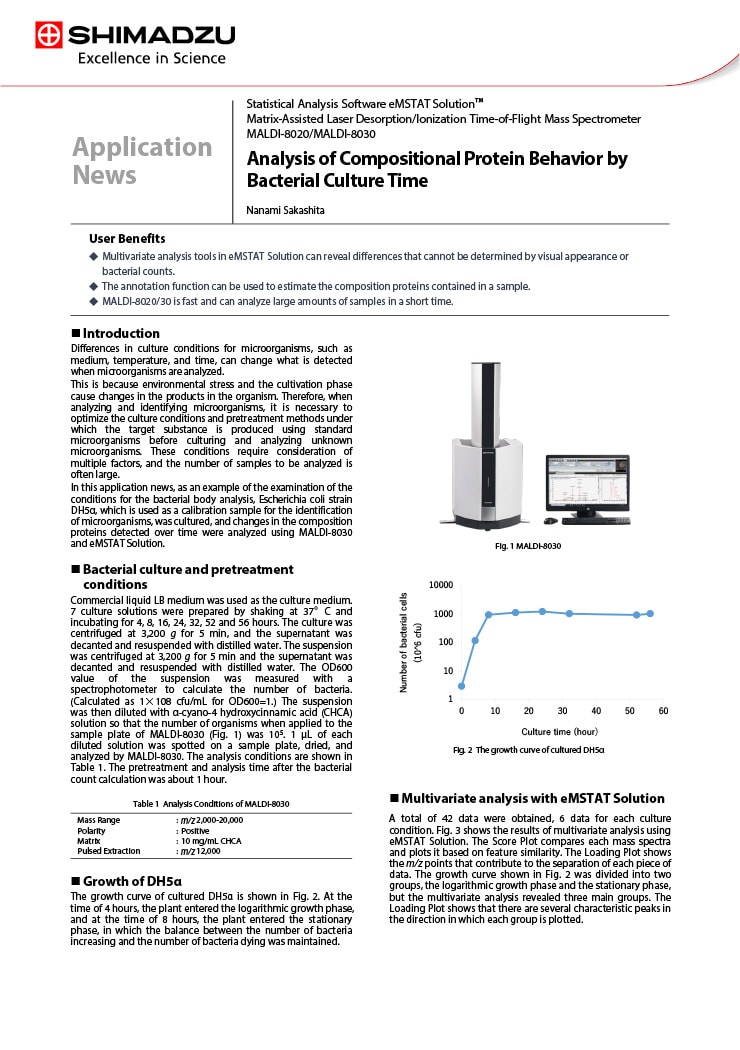 eMSTAT Solution Ver. 2.0 statistical analysis software is the first statistical analysis software in the industry for chromatograms to feature machine learning capabilities. The software uses analysis data obtained by a liquid chromatograph (LC), gas chromatograph (GC), and MALDI (matrix-assisted laser desorption/ionization) type mass spectrometer (MS). Since multivariate analysis can be easily performed, differences between target groups can be clarified and shown in comparisons with other products during product development in the food sector or in determining the quality of products during quality control assessments. The software features two modes: a Statistical Analysis Mode for easy visualization of differences and a Discriminant Analysis Mode that identifies unknown samples with models created through machine learning.