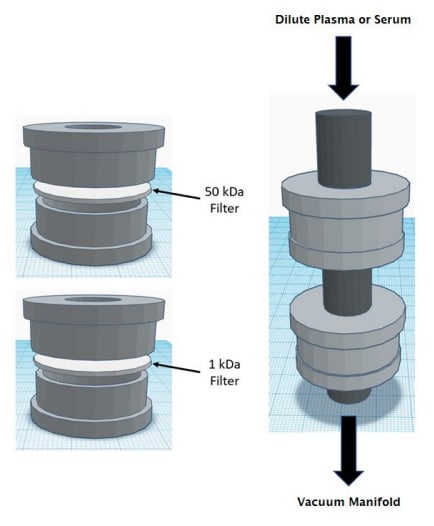 We 3D printed a dual filtration system to isolate peptide and protein molecules from biological samples. The system was designed to use molecular weight cutoff filters or dialysis membranes for separation. Initially, we tested the apparatus with a mixture containing one peptide and three proteins (Glu-Fibrinopeptide, Cytochrome C, Myoglobin, and Bovine Serum Albumin). MALDI-TOF MS was used to acquire spectra from the low, mid, and high fractions Figure 2. These data show we were successful at isolating Cytochrome C and Myoglobin. However, the Bovine Serum Albumin was not completely removed from the sample. Additionally, it was observed that Glu-Fibrinopeptide was present in the middle fraction but a small amount was not capture by the low molecular weigh cutoff filter. There are three possible reasons for this outcome. First, the buffer system used to dilute the sample could affect the filters porosity. Second, it is conceivable a leak could cause molecules to circumvent the filters. Lastly, the structure of the molecules could allow them to pass through the pores. To overcome these potential pitfalls, we can alter the design of the filtration system and evaluate new molecular weight cutoff filters or dialysis membranes.