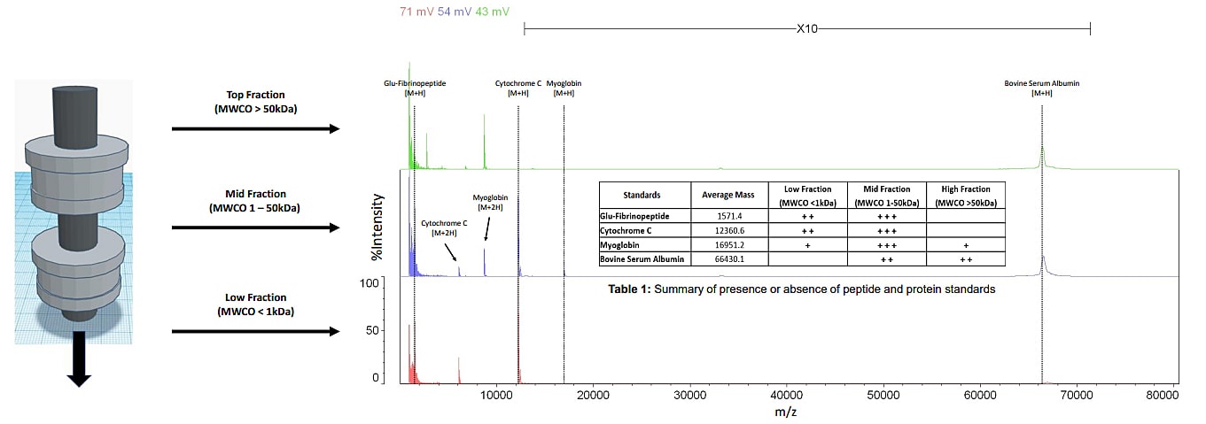 - Using the dual membrane device (Figure 1) the peptides and proteins were separate into three fractions; less than 1kDa (Low), less than 50kDa (Mid), and greater than 50kDa (Top).