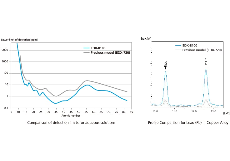 The EDX-8100 energy dispersive X-ray fluorescence spectrometer offers a high level of accuracy and speed in analyzing elements contained in various samples. It supports ultra-light element analysis of 6C to 92U, and can be used in conjunction with the helium substitution option to analyze liquid samples containing light elements (F to Al) as is.