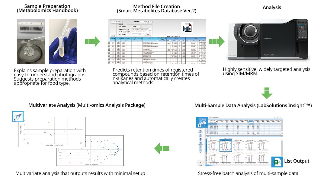 Shimadzu provides complete support for GC/MS food metabolomics analysis from sample preparation to visualization on metabolic maps and multivariate analysis. The "Metabolomics Handbook" compiles practical information on food sample preparation, allowing even newcomers to food metabolomics to output results up to and including multivariate analysis.