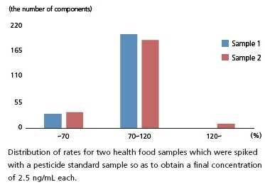 • In conducting recovery tests in health foods for 220 pesticides, using the database, recommended pretreatment kit, pretreatment protocol, and Certified standard substances, we succeeded in obtaining excellent ratios in over 80 percent of components.