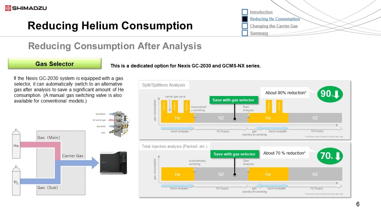 Due to helium gas supply shortages, soaring prices, and other factors, reducing the quantity of helium gas consumed and considering alternative carrier gases have become urgent issues. The following describes functionality for reducing helium gas consumption rates and indicates precautions for switching to a different carrier gas.
