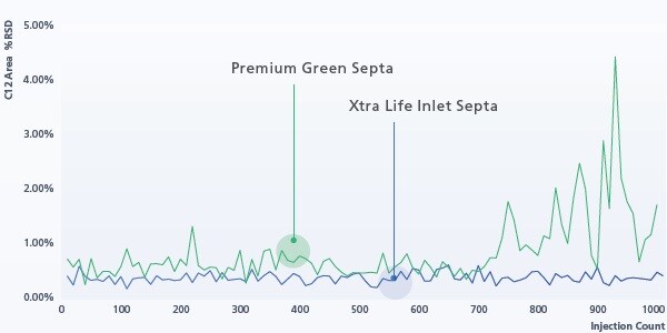 Comparison of C12 area reproducibility of Xtra Life inlet septa and Premium Green septa for 1000 continuous injections