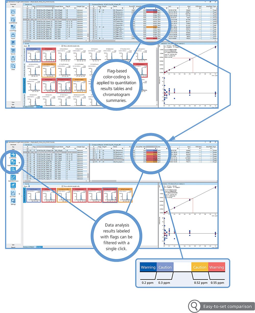 Insight contains over 75 user-controlled QA/QC flagging criteria for retention times, reference ion ratios, concentration limits, and more. Configurable color-coding is available to highlight results that are near or outside of limits.