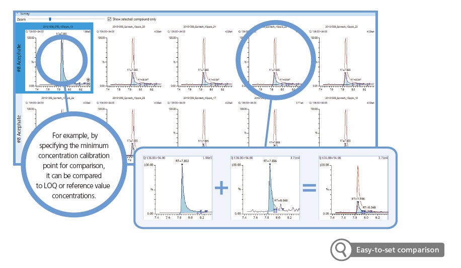Insight allows the user to view a large number of chromatograms at once. To make data review easier, each chromatogram can be overlaid with a reference peak, such as the reference ion chromatogram or a low-level standard.