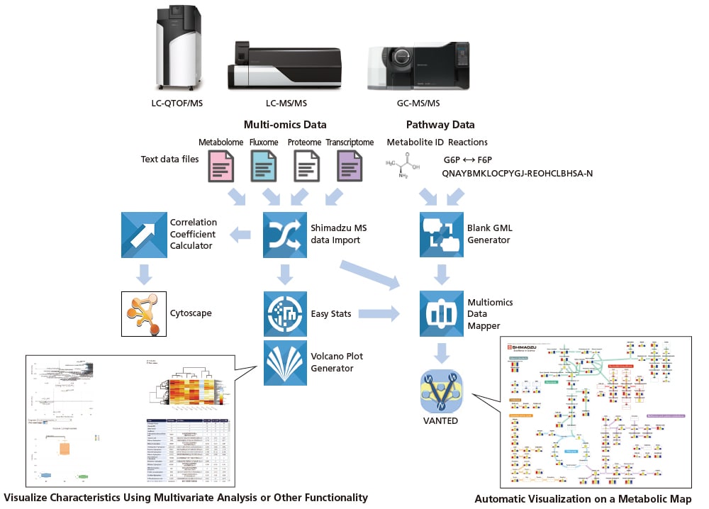 The Multi-omics Analysis Package is metabolic engineering software that can automatically generate metabolic maps and perform a variety of data analysis based on the vast amounts of mass spectrometry data generated in fields such as metabolomics, proteomics, and flux analysis. In conjunction with the various method packages and databases offered by Shimadzu for metabolomic analysis, the Multi-omics Analysis Package can help increase the efficiency of metabolomic data analysis work. The intuitive visualization of data provides powerful support for drug discovery, functionally-enhanced foods, bioengineering, and other life sciences research applications.
