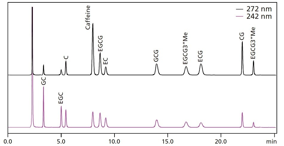 Catechins are a type of polyphenol and classified as flavanols in the flavonoid family of compounds. With this analysis kit, it is possible to simultaneously analyze caffeine and 11 kinds of catechins in 35 minutes. In addition to methylated catechin, which is said to have anti-allergy properties, other catechins include epigallocatechin gallate, epigallocatechin, epicatechin gallate, and epicatechin, the main catechins in green tea.