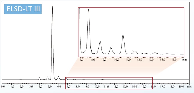 The evaporative light scattering detector (ELSD) is a general-purpose universal detector that can even detect components with no UV absorption, such as carbohydrates, lipids, surfactants, and synthetic polymers.*