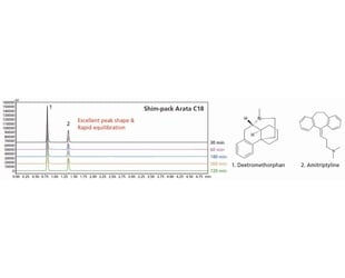 Even for LC columns that claim to be designed for basic compounds, adequate resolution often can not be obtained due to problems such as leading of highly polar basic compounds, peak shape deterioration of acidic compounds, or long equilibration time required for low ionic strength acidic mobile phase. All of these issues have been solved with Shim-pack Arata that was specifically designed to give unmatched peak shape for basic compounds.