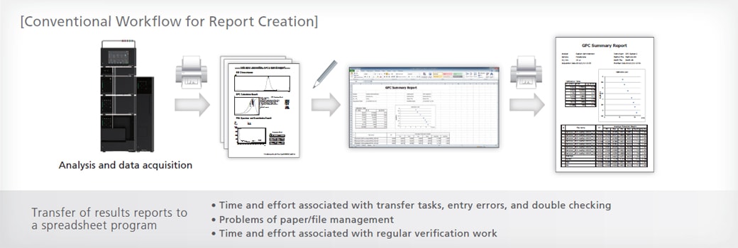LabSolutions includes a multi-data report feature, which reduces the work involved in report creation. Analytical results are automatically entered into a spreadsheet equivalent to the one used in Excel, eliminating the need to move the data.