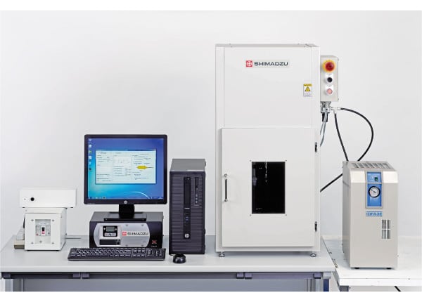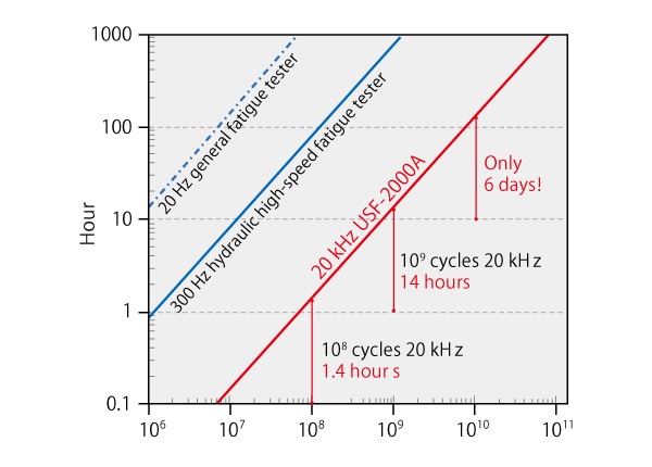 This ultrasonic fatigue testing system achieves a vibration rate of 20 kHz by applying a vibration generated by a Piezoelectric element and amplified by a horn. This not only significantly reduces cycle times, it also helps discover microscopic defects and inclusions in high-strength steel materials, which can cause fatigue fractures at the megacycle level.