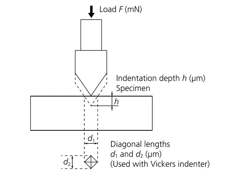 A new evaluation system for measuring the material strength of micro regions, such as semiconductors, LSI, ceramics, hard disks, vapor deposited films, and thin coating layers, not addressed by previous hardness testers. It can also be used to evaluate the hardness of plastics and rubbers. This instrument uniquely measures dynamic indentation depth, not the indentation after the test. This in turn permits measurement of very thin films and surface (treatment) layers that are impossible to measure with conventional methods. Additionally, this same method supplies the data needed to calculate elastic modulus on the test specimens.