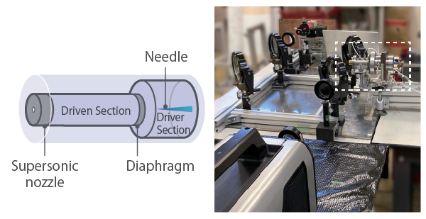 The shock wave generated when releasing air at eight times atmospheric pressure was captured using a Mach-Zehnder interferometer. The shock tube consists of a driver section, a driven section, a supersonic nozzle, and a needle. A plastic diaphragm is placed between the driver and driven sections, and during the test, the diaphragm is ruptured using the needle to generate the shock wave.