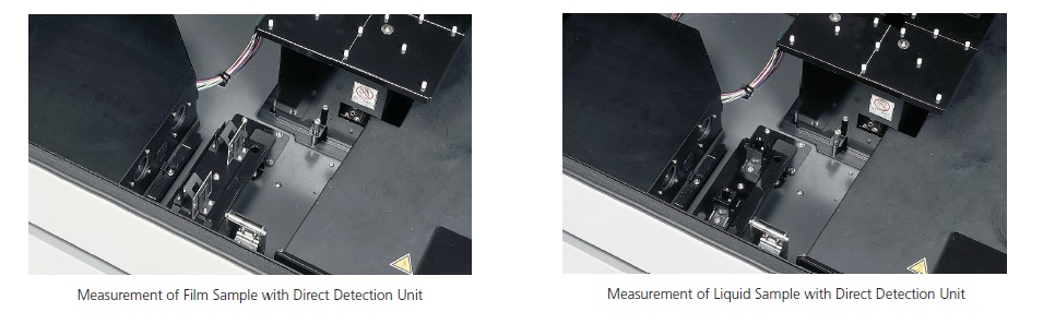 The SolidSpec-3700i/3700i DUV measure samples with an integrating sphere as the standard detection system. However, some samples require measurement without using an integrating sphere. The Direct Detection Unit was created for just such instances. By mounting the Direct Detection Unit (DDU-DUV) in the SolidSpec-3700i DUV, measurements down to 165nm(note) are possible. Measurements with the Direct cDetection Unit can be performed simply by switching a mirror.
