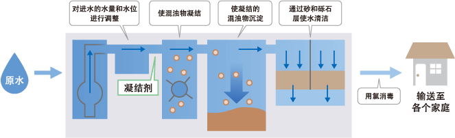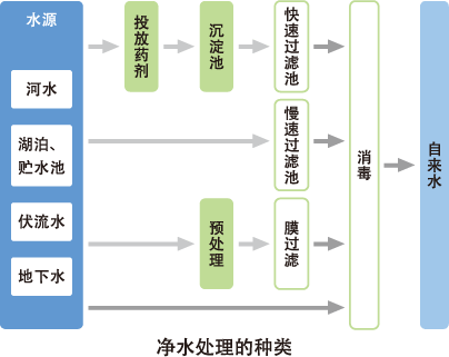 如上所述,根据河流、湖泊和地下水等的水质,进行净水处理,即可制造出可直接饮用的自来水。