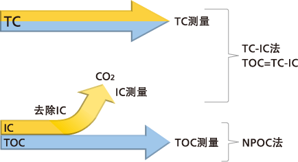TC-IC法和NPOC法都是用来测量TOC的方法,但根据试样特性决定使用哪种测定方法。