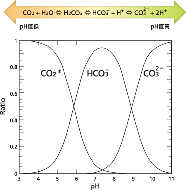 pH低时,平衡按照上式向左移动,当pH=3以下时,几乎所有的IC都变成溶解二氧化碳。