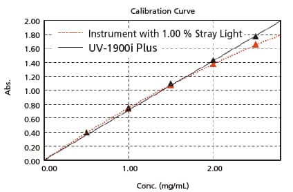 - Linearity will be lost in the high absorbance region due to stray light. UV-1900i Plus is equipped with Low Stray Light Diffraction Gratings, achieve “best-in-class” low stray light. Stray light is at 0.5 % max. (198 nm), making accurate measurements possible at 1 Abs or more, even in the ultraviolet region. In addition, high-concentration samples can be quantified accurately.