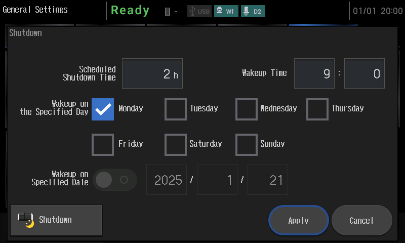 Automatically wakes up a sleeping UV-1900i Plus at a specified time. This function eliminates the need for analysts to wait for it to warm up, allowing them to be more productive.