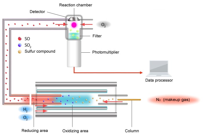 Sulfur compounds are converted to an X-S chemical species (mainly SO) that is capable of exhibiting chemiluminescence inside an extremely high temperature (around 1000 °C) oxidative-reductive furnace. The X-S chemical species is carried to the detector area where ozone converts it into an excited-state SO2* (radical). The SO2* emits light upon returning to its base state, and the SCD detects the sulfur component by measuring this light with a photomultiplier tube.