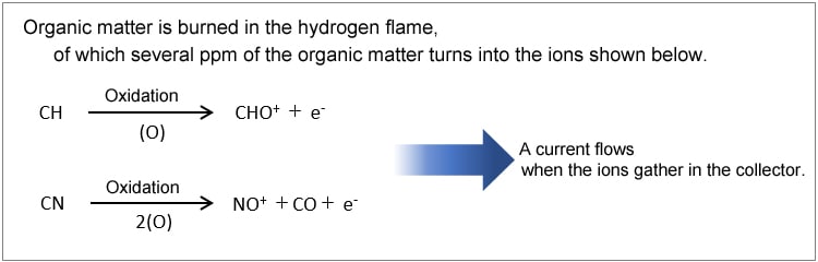The FID creates a hydrogen flame by burning air and hydrogen supplied from below. The carbon in a sample carried into the detector on carrier gas is oxidized by the hydrogen flame, which causes an ionization reaction. The ions formed are attracted by a collector electrode to an electrostatic field, where the components are detected.