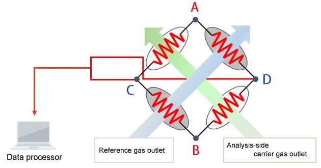 The principle of detection used by the TCD is as follows. The TCD detects target components by reading the change in filament temperature caused by the difference in thermal conductivity between the carrier gas and target components.