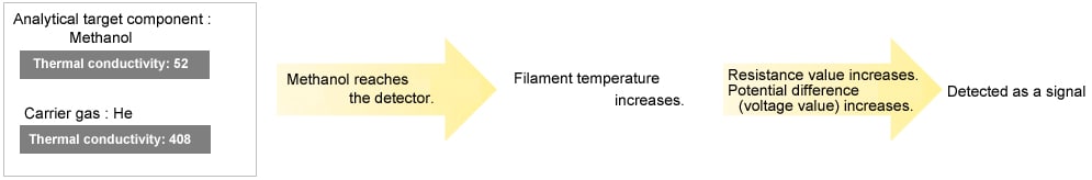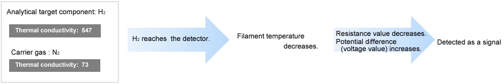 When the thermal conductivity of the analytical target component is lower than the carrier gas, the TCD reads an elevation in filament temperature. Conversely, when the thermal conductivity of the analytical target component is higher than the carrier gas, the TCD reads a decrease in filament temperature.