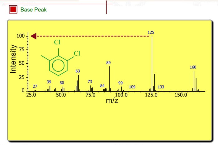 The vertical axis denotes the relative abundance of ions. The most intensive peak in a spectrum is called the "Base Peak", whose intensity is taken as 100 percent. This ion exists most abundantly in the ion source and represents the most stable ion, which is useful for identifying the compound.