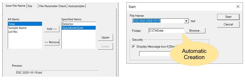LabSolutions TA enables automatic file naming when starting a measurement.