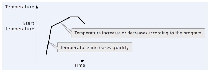 If a start temperature has been configured, as soon as a measurement begins, the temperature will quickly increase or decrease to the specified value. After this, the temperature will be increased or decreased in accordance with the prescribed temperature program.