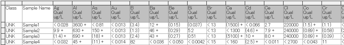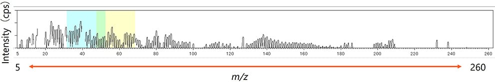 Ions separated in the quadrupole mass spectrometer by m/z are scanned from low to high mass at high speed. A mass spectrum is generated with ion intensity on the vertical axis and m/z on the horizontal axis, referred to as a total mass profile or mass spectrum (Figure 1). This total mass profile acts as a rapid qualitative analysis performed for each sample. In this, the full available mass range that contains all sample elements (m/z=5 to 260) is output as the total mass spectrum. The ion intensities shown in the total mass spectrum can also be used together with database sensitivity coefficients to obtain semi-quantitative data.