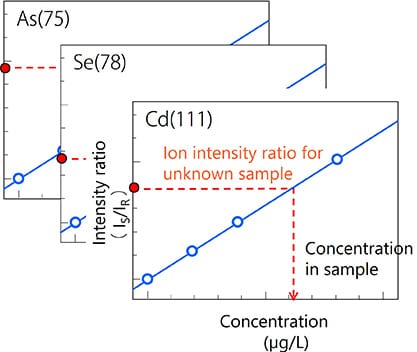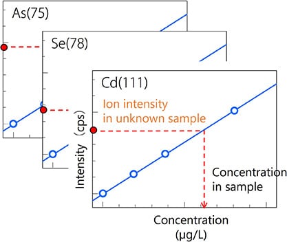 Quantitative analysis is performed on a single isotope or set of isotopes as specific mass-to-charge ratios (m/Z). The mass number of each is chosen in advance and analysis is performed at longer integration times than with qualitative analysis. A set of standard solutions of known concentration are prepared and analyzed, which result in a calibration curve that ion intensity (cps) on the vertical axis and concentration on the horizontal axis by the least squares method. Next, an unknown sample is analyzed, and the detected ion intensity is converted to concentration based on the relationship established by the generated calibration curve equation (Figure 3). Since ICP-MS is also capable of analysis of multiple elements in a single mass sweep, when intending to measure multiple elements in a sample, a mixed standard solution can be used to create calibration curves to set up for all the elements required gathered concurrently in a single run.