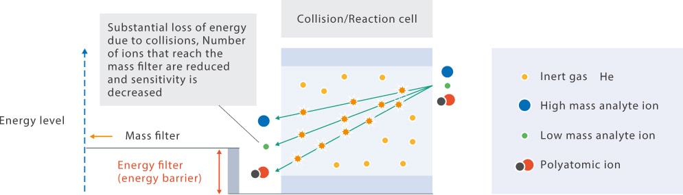 The cell gas must also be selected for a given analyte and its corresponding influence. As mentioned in section Collision/Reaction Cell, performing analysis in collision mode with inert He gas does not cause any secondary reactions and should provide effective polyatomic interference removal for most target analyte elements regardless of the matrix elements in the sample. Low mass analyte elements are the exception to this as they lose a large amount of energy from collisions with He due to the similar mass. This energy loss causes a substantial reduction in measurement sensitivity since many ions will subsequently be removed by the kinetic energy barrier. He gas collision mode is occasionally used with low mass analyte elements when there is a high sample concentration or when the sensitivity requirements are low, but low mass elements are typically analyzed in a "no gas mode" without He using a vented cell gas.
