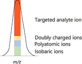 In cases when interference cannot be avoided, it should be removed by a collision/reaction cell or corrected for (inter-element correction, half-mass correction, and interference correction equations). It is important to know the type of interferent to best correct for it. Collision gas may have little to no effect on isobaric interference and such gasses are not generally effective on some doubly charged species. Reaction gasses can be useful to mitigate some of dubly charged species but may also affect the element of interest. Half mass corrections have no effect on polyatomic interferences. In sum, interference correction takes some user knowledge and experience, but the total mass profile can be very helpful in trying to determine the source of the interferent.