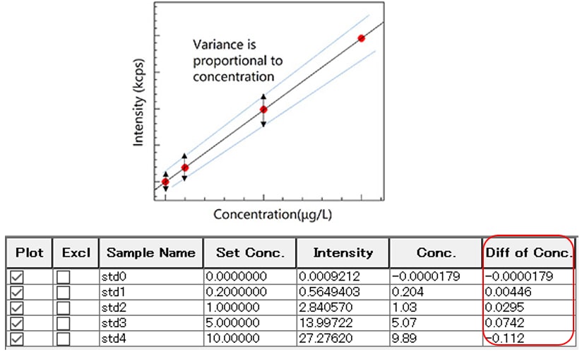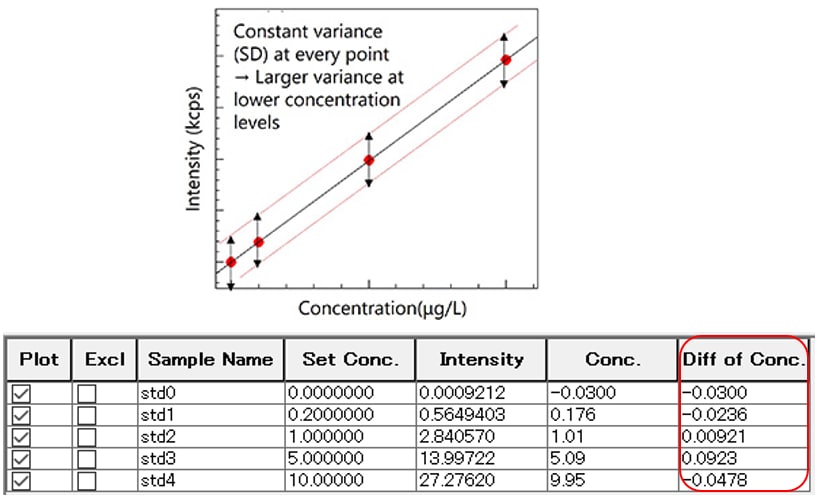 Using the least squares method creates a regression line with constant variance (standard deviation: σ) at each data point. As a result, the relative error between the actual concentration of the calibration curve sample and the measured concentration based on the regression curve increases with decreasing concentration. Accuracy can be increased at lower concentrations by using weighting to make the variance proportional to concentration, reducing the error in the low concentration region.